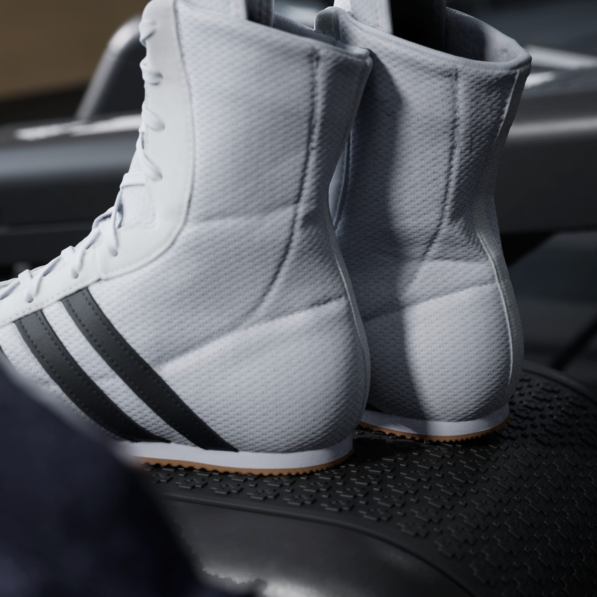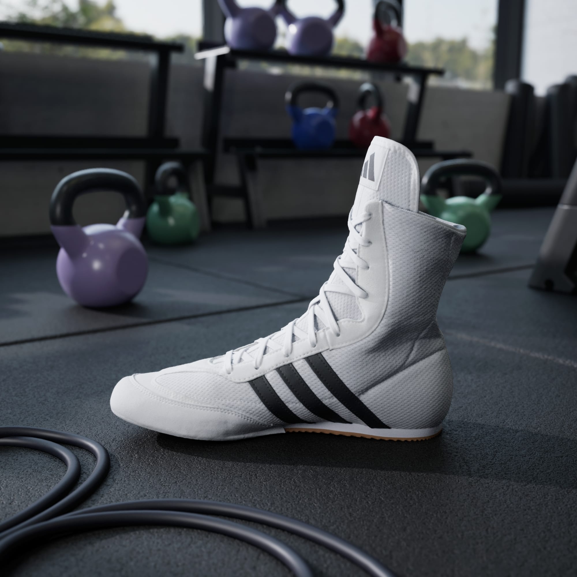 Não conseguem acertar no que não veem. Estes sapatos de pugilismo Box Hog da adidas permitem-te dançar pelo ringue graças ao topo em malha leve, à fina entressola em EVA e à sola de borracha aderente. O design de cano médio e os reforços no interior proporcionam estabilidade quando aumentas o ritmo.