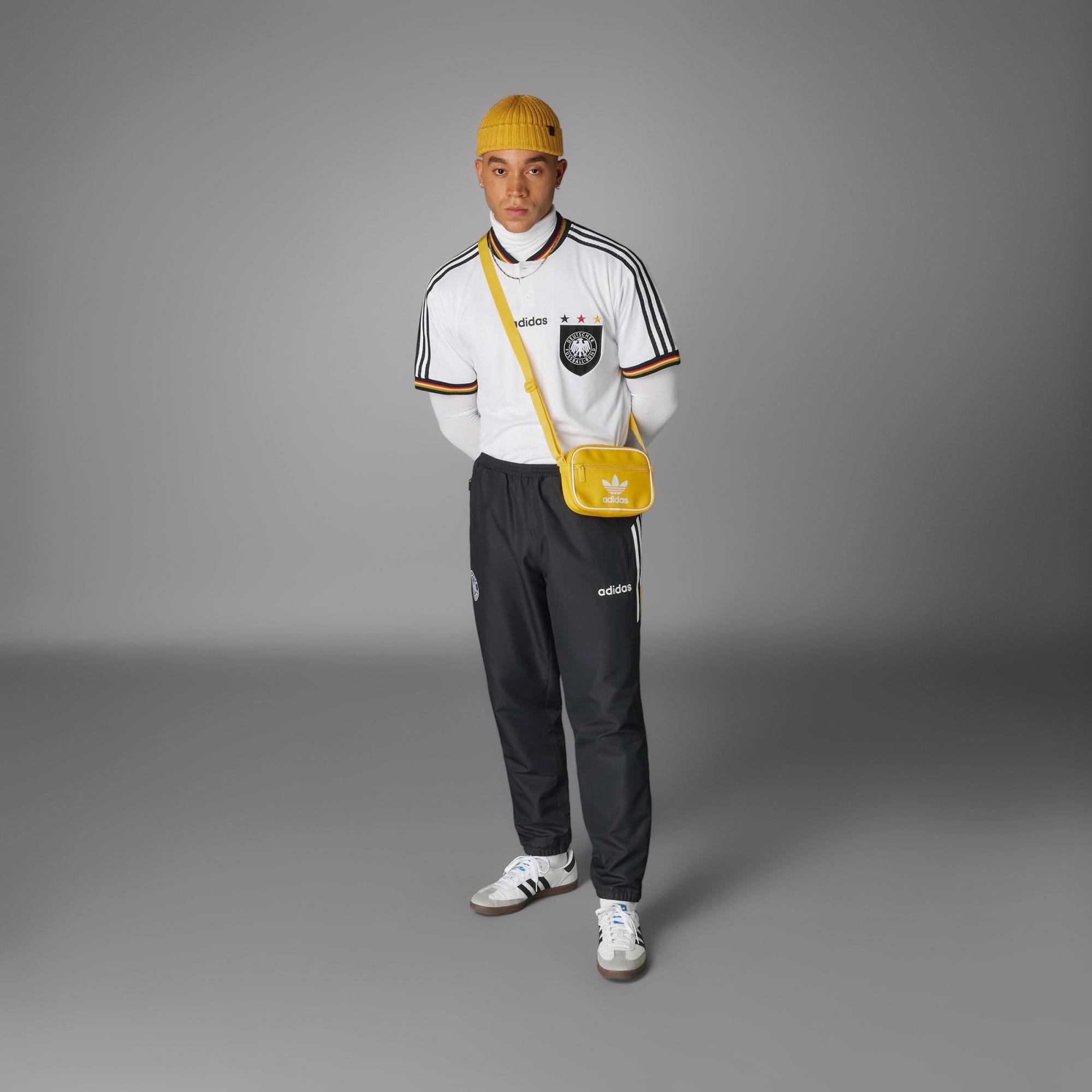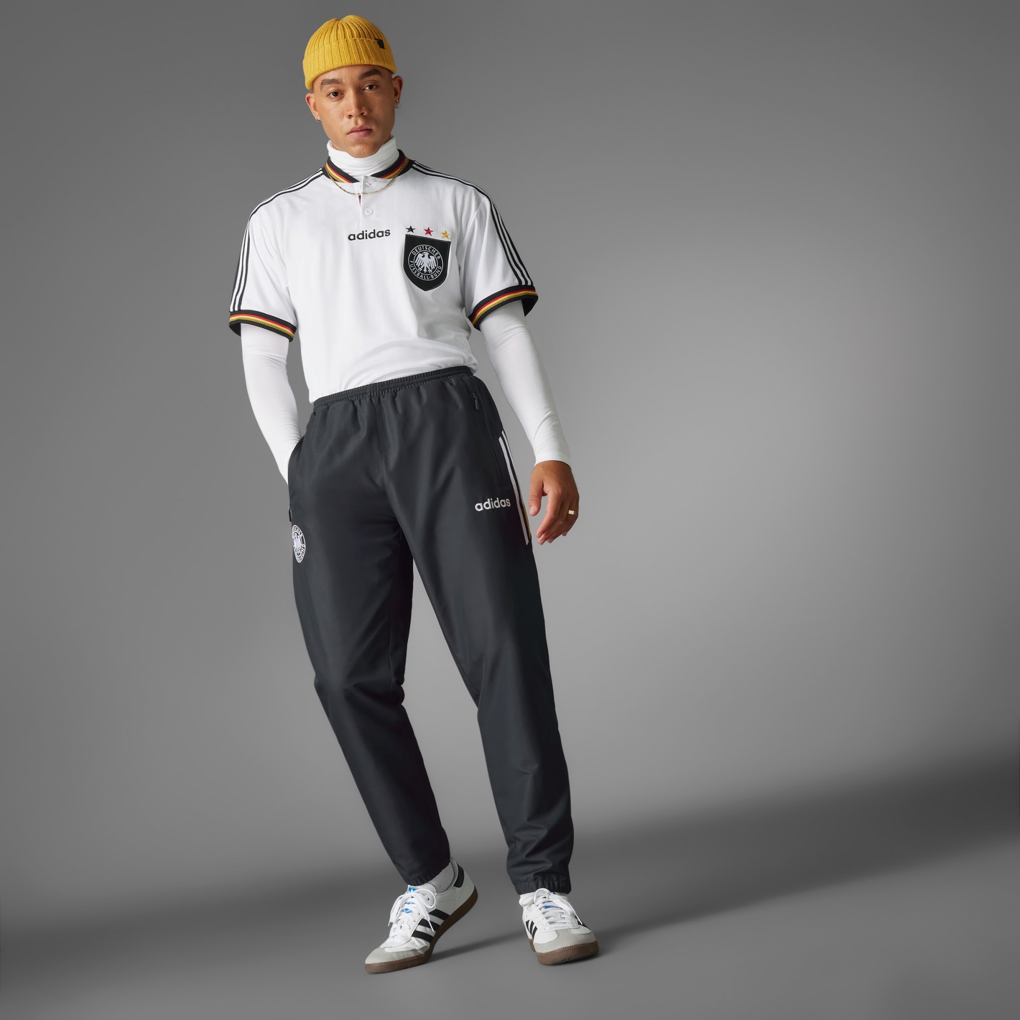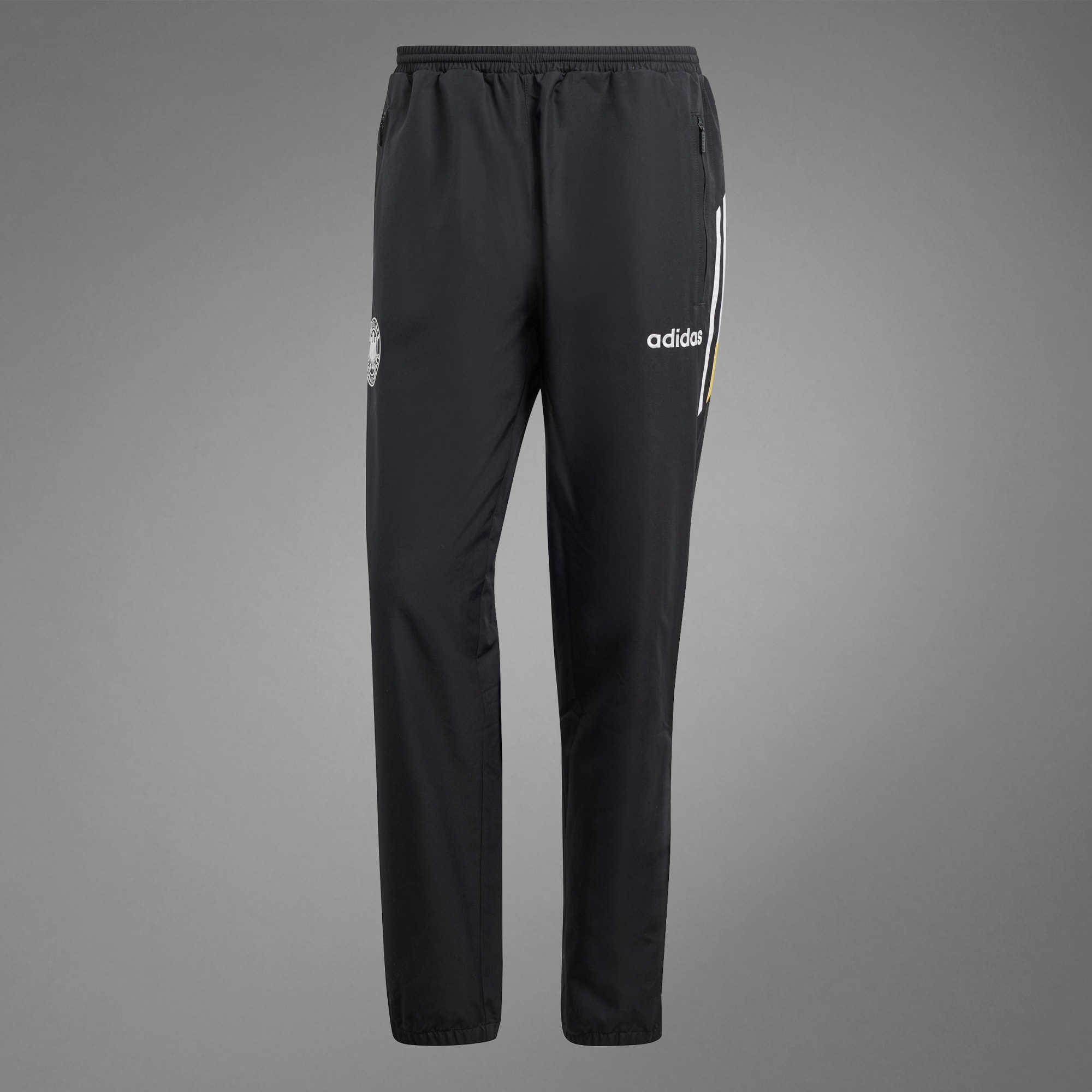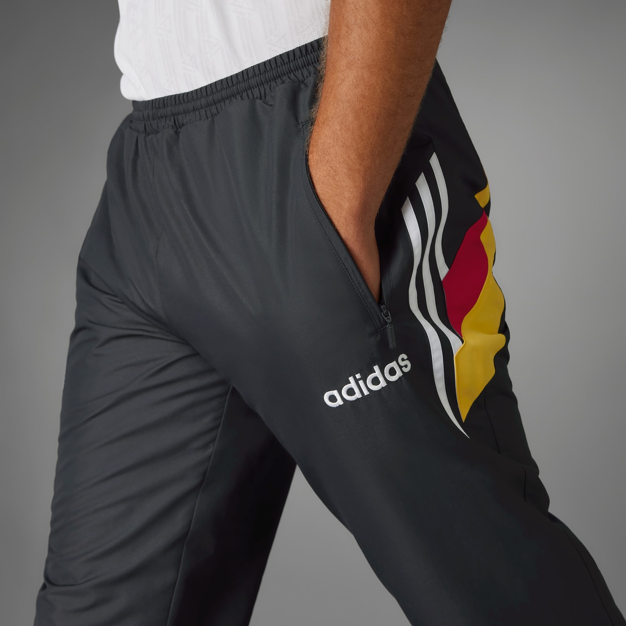 Relembra memórias vibrantes da glória futebolística da Alemanha sempre que quiseres. As calças 1996 da Alemanha recuperam a estética icónica dos anos 90 para elevar o teu estilo. Aconchega-te com estas calças supersuaves feitas para o conforto derradeiro. Com o logótipo adidas clássico e o emblema germânico na perna, este look vintage é um regresso à era dourada do futebol. Combina com a tua t-shirt e camisola com capuz favoritas para emanares estilo onde quer que vás. Ao escolher materiais reciclados, conseguimos reutilizar materiais já criados, o que ajuda a reduzir o desperdício e a nossa dependência de recursos finitos.