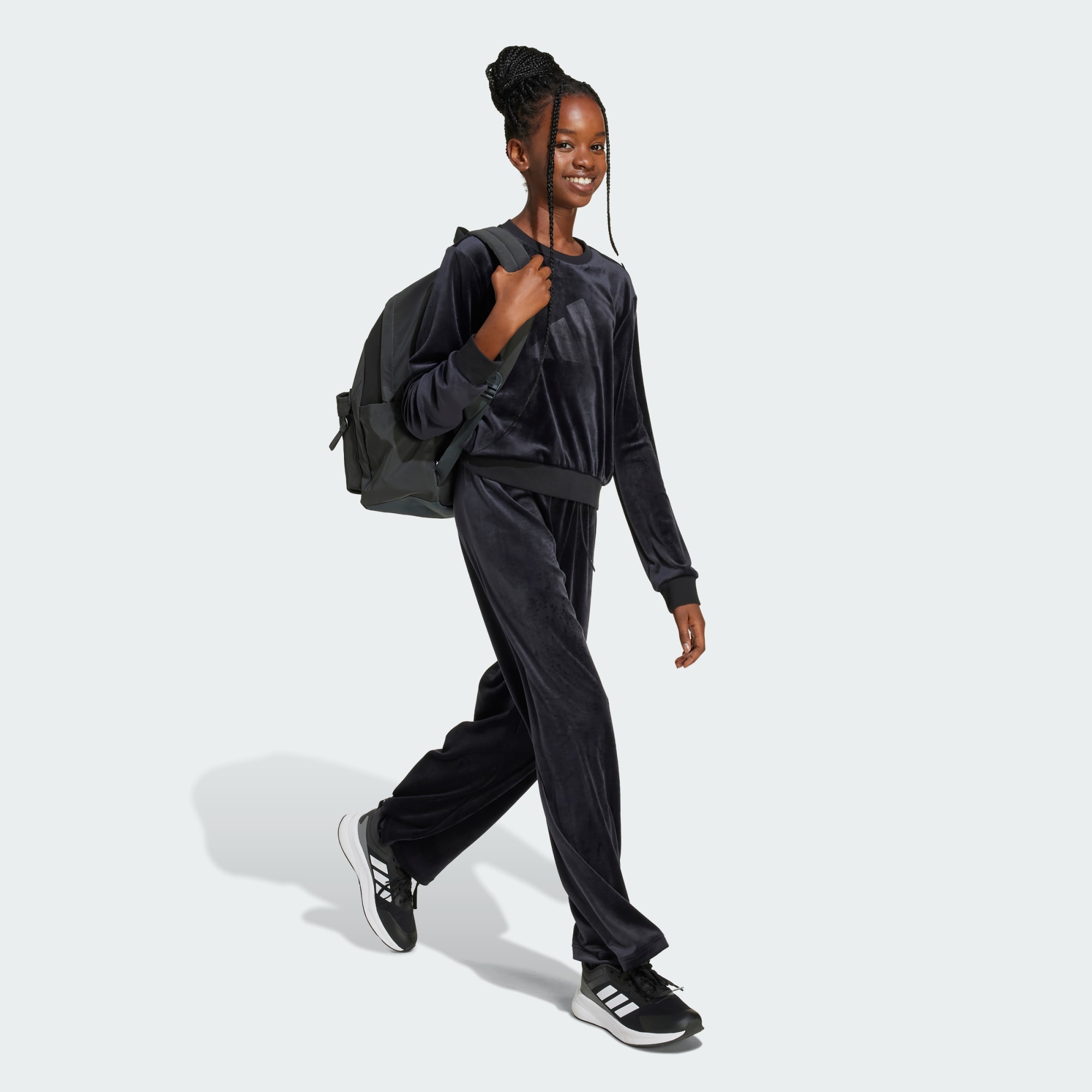 Casuais mas chiques, estas calças adidas em tamanho júnior são perfeitas para vestir num estilo mais ou menos formal. As pernas largas criam uma silhueta descontraída que combina bem com uma t-shirt ou sweatshirt ajustada. O tecido de veludo confere-lhes um aspeto de luxo. Um logótipo subtil em baixo relevo na perna acrescenta um toque desportivo ao design simples.