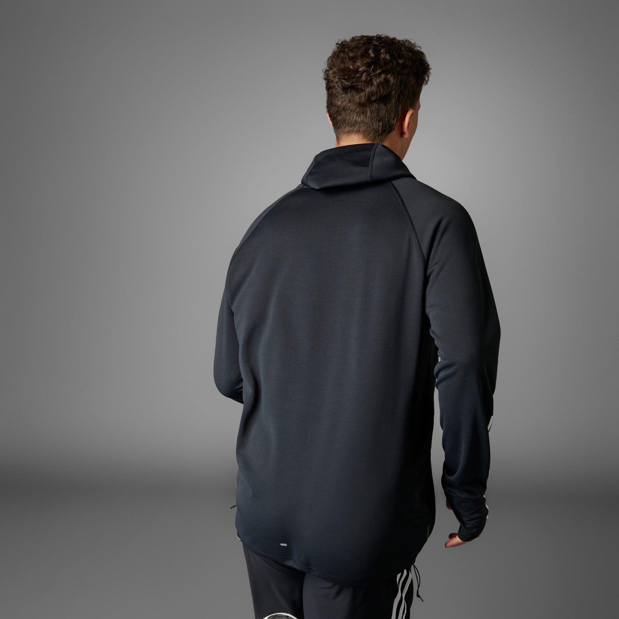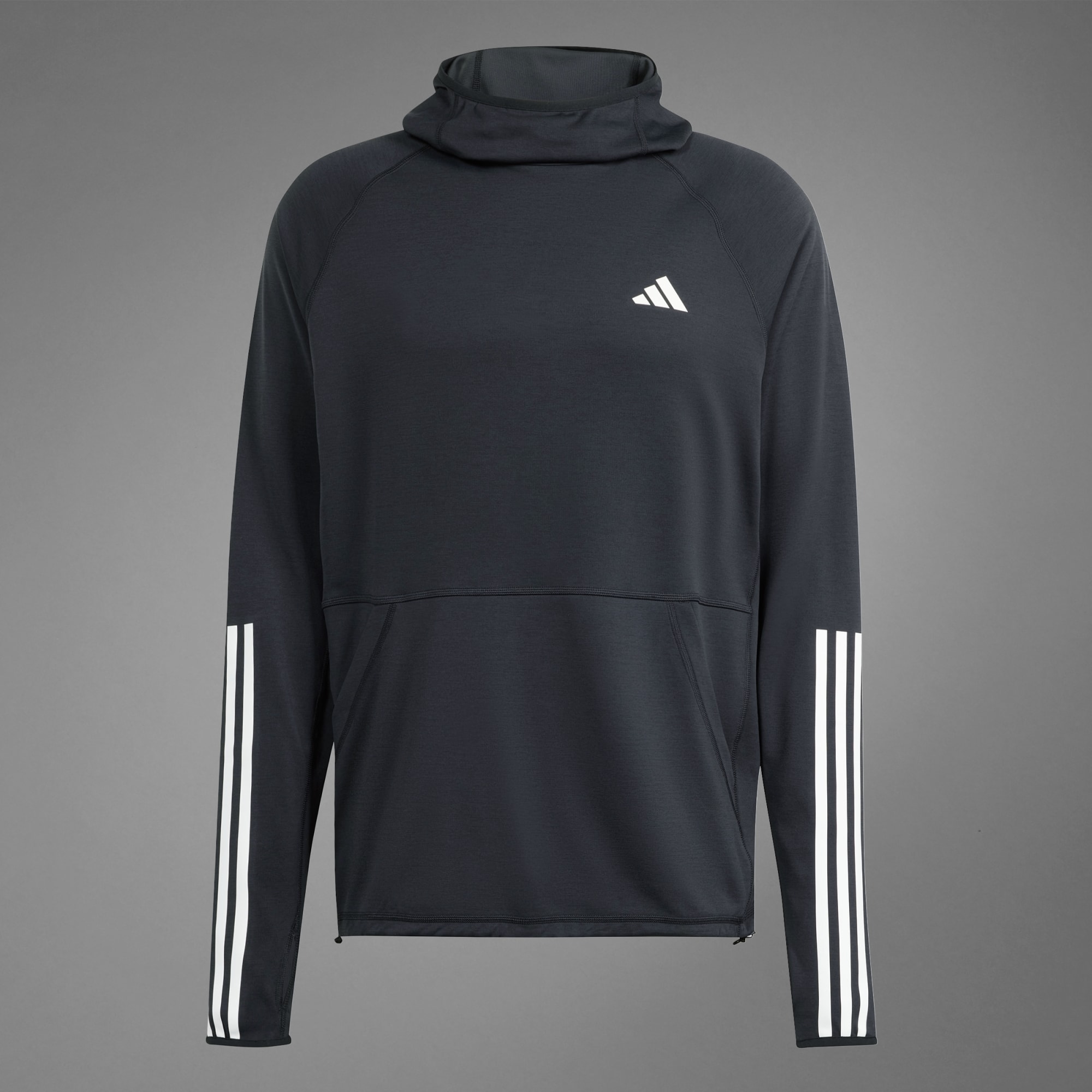 Uma camisola com capuz 3-Stripes Own the Run feita com materiais reciclados.