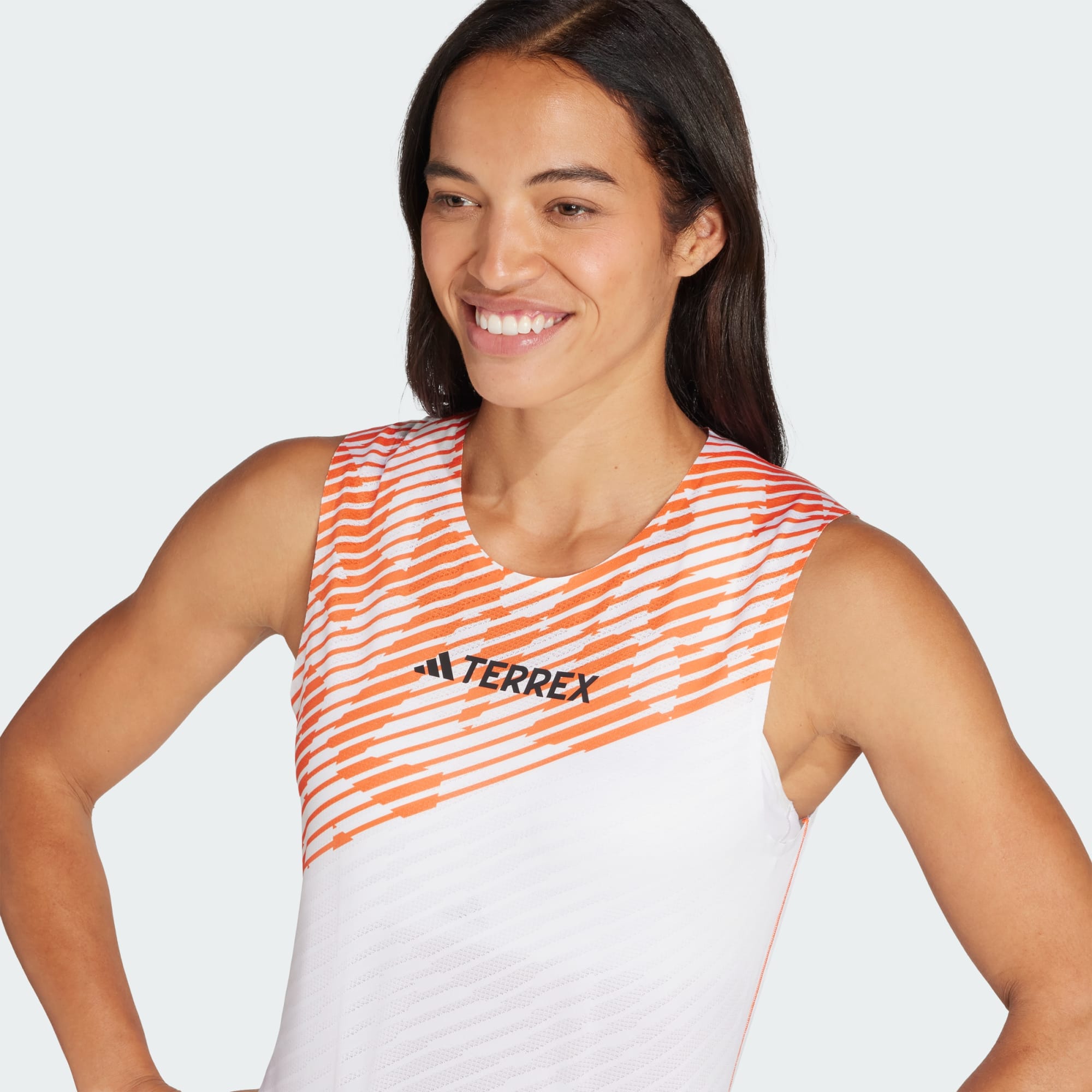 Uma camisola de alças de desempenho para trail running feita com materiais reciclados.