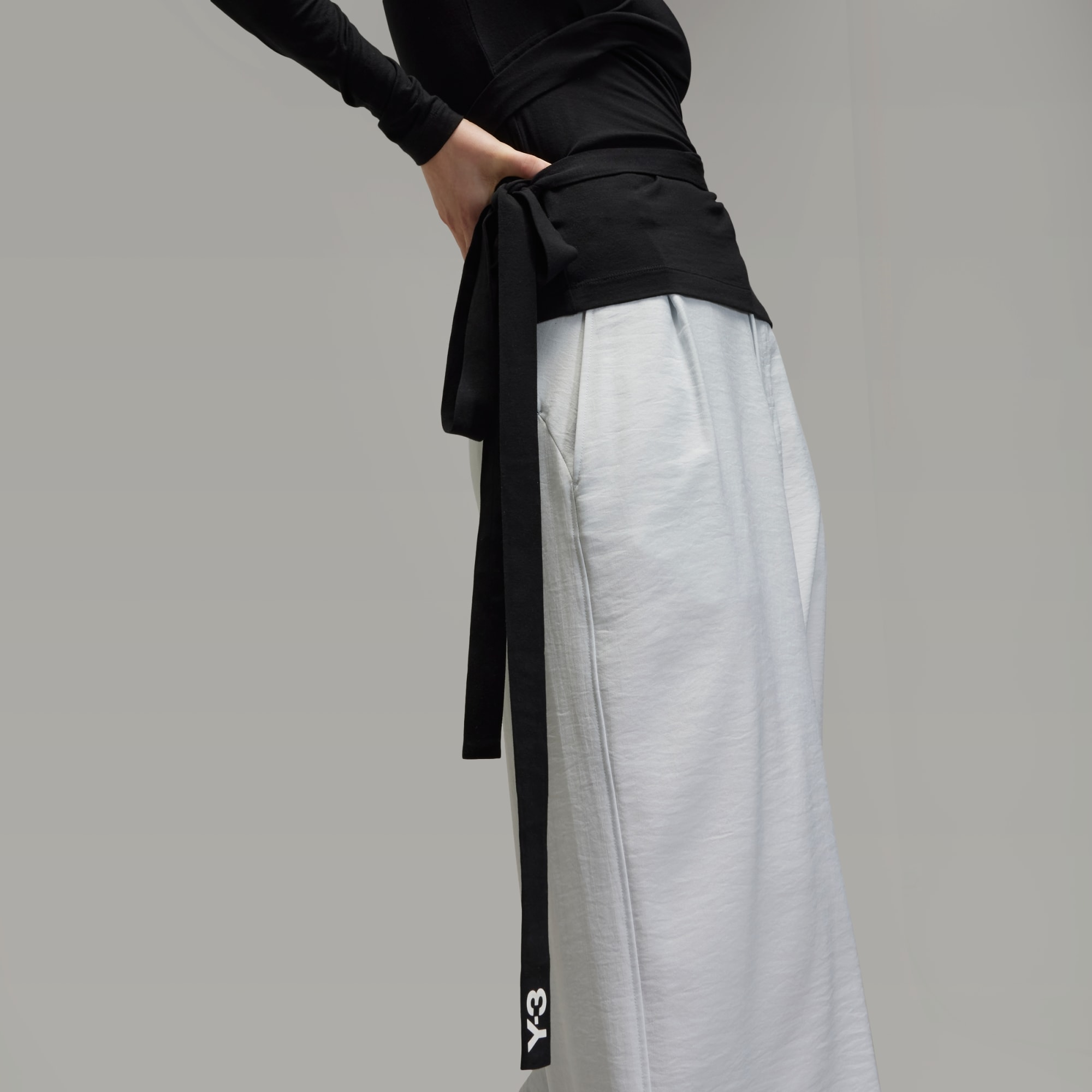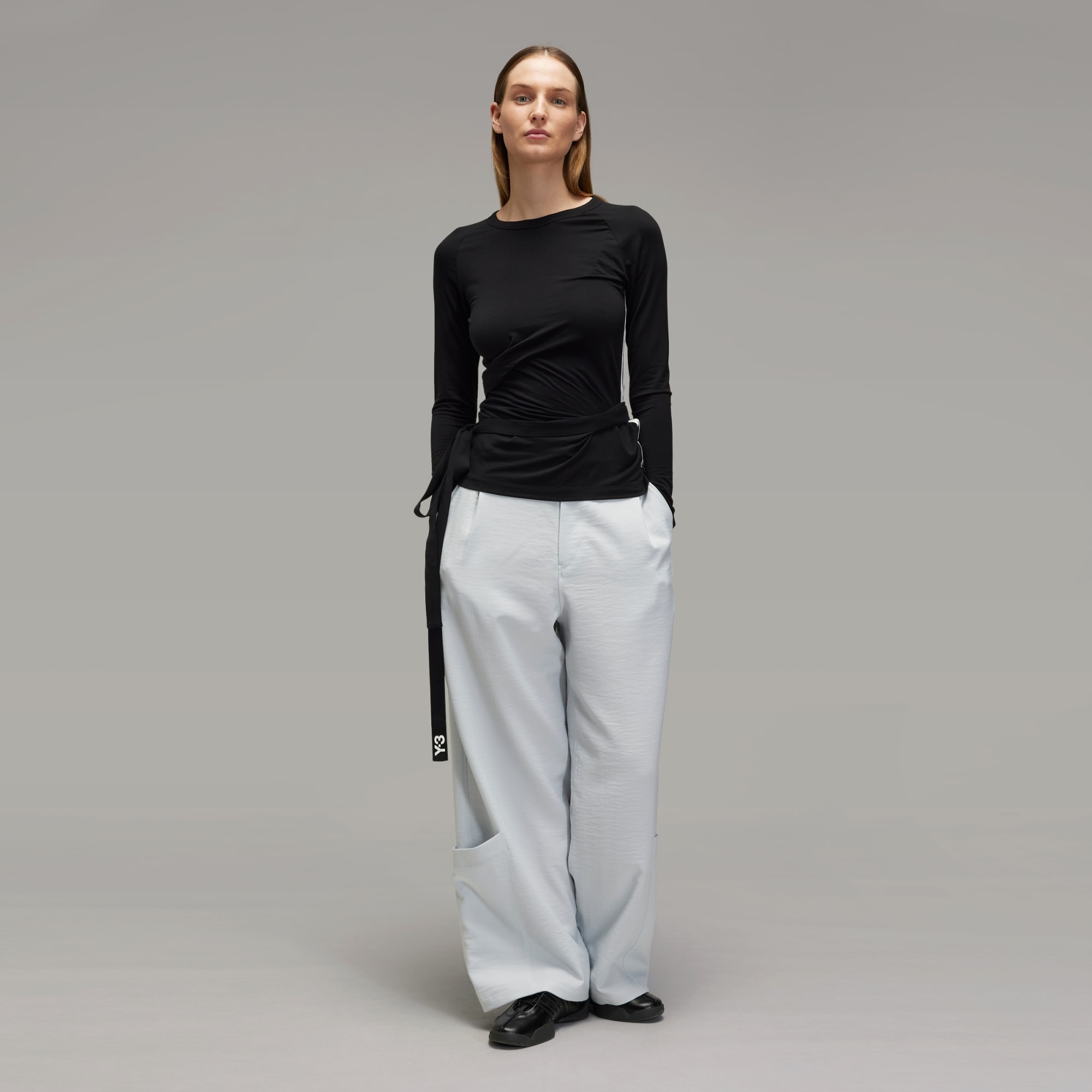 As fitas compridas da camisola Y-3 podem envolver o corpo como um cinto, ou fluir livremente sobre a silhueta. A camisola foi feita em tecido suave e ligeiramente elástico, e foi decorada com as 3 riscas contrastantes num dos lados.