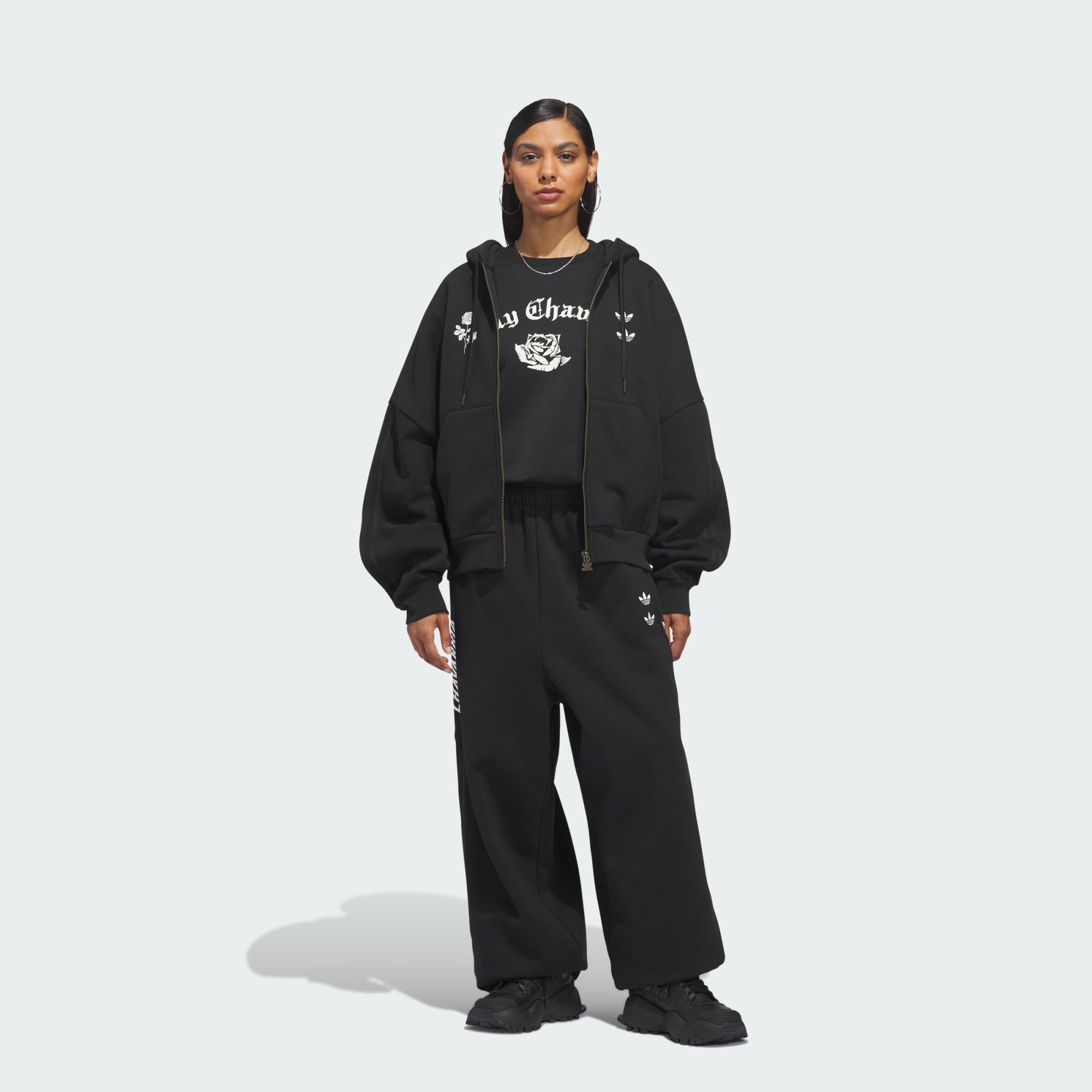 O casaco com capuz Heavyweight Chavarria foi confecionado num tecido de moletão denso para proporcionar o máximo conforto. O casaco com capuz foi concebido com proporções volumosas no corpo e nos braços. Os detalhes funcionais incluem cós e punhos canelados, capuz e um bolso marsupial. O casaco com capuz tem um fecho de correr centrado à frente. A marca é simbolizada por dois trevos bordados no lado esquerdo do peito e pelas 3 riscas da adidas aplicadas nas mangas e na parte superior do capuz. Apresenta uma rosa bordada no lado direito do peito e a inscrição "Willy Chavarria" e o trevo da adidas bordados nas costas.