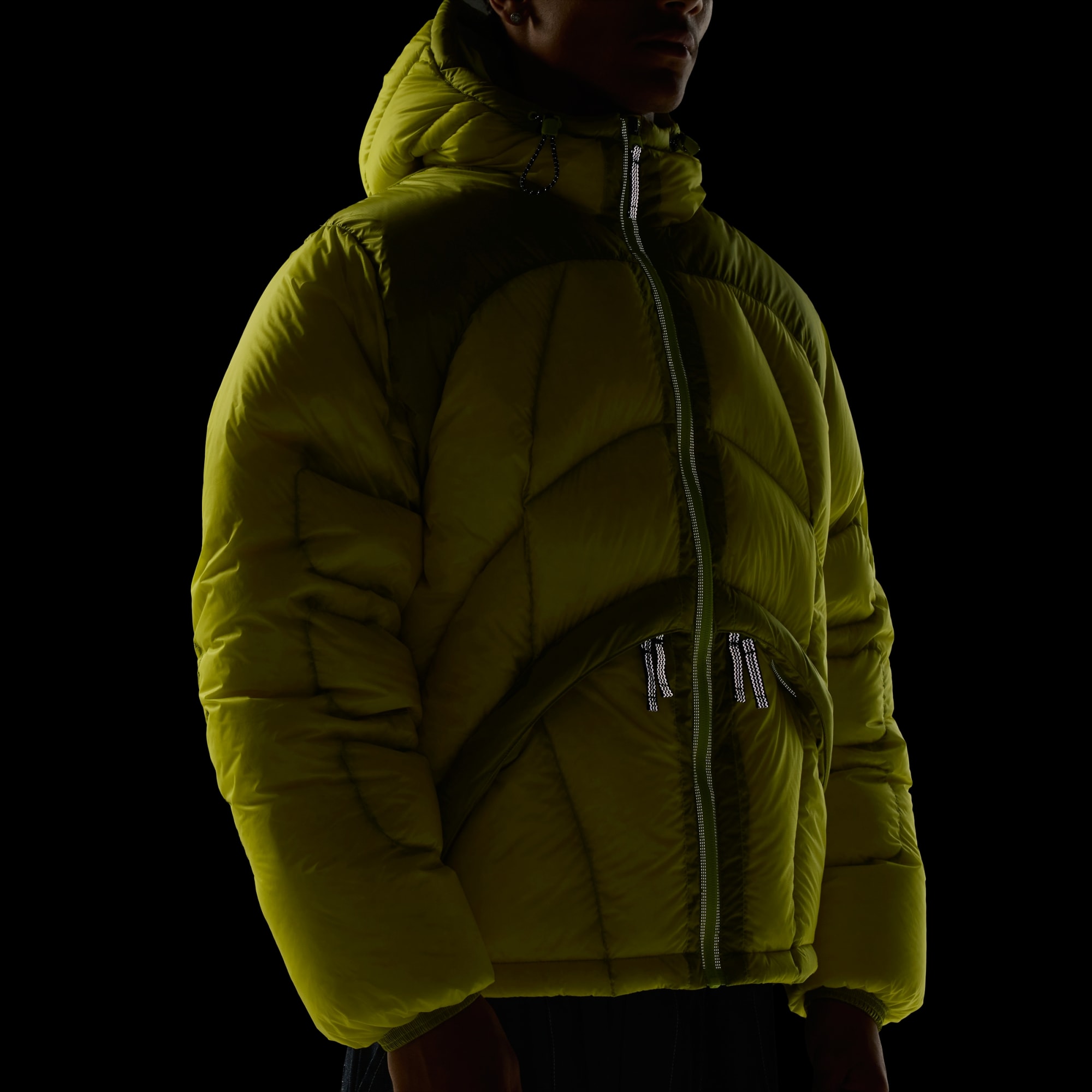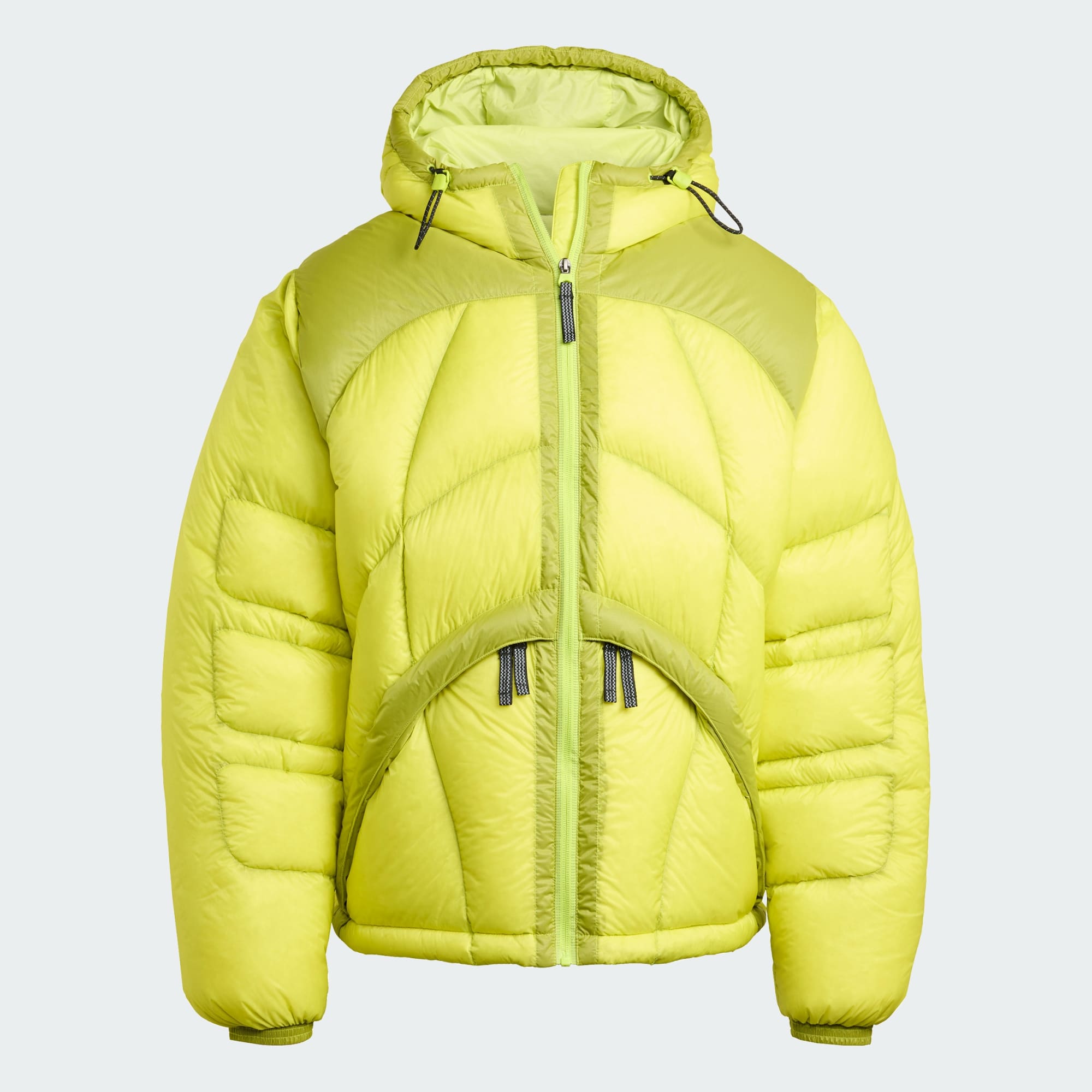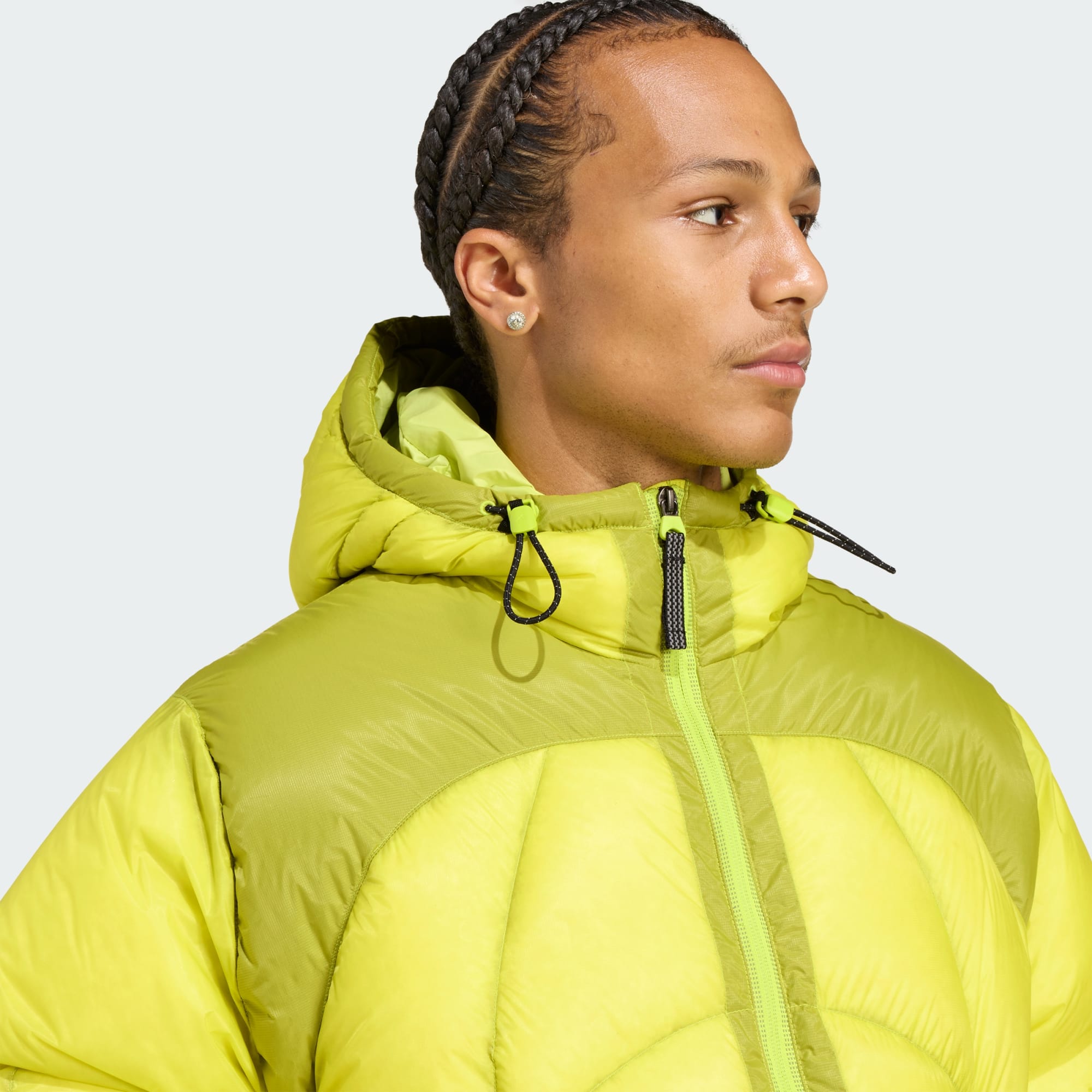 Casaco de penas com bainha e capuz com cordões ajustáveis para um ajuste personalizado.