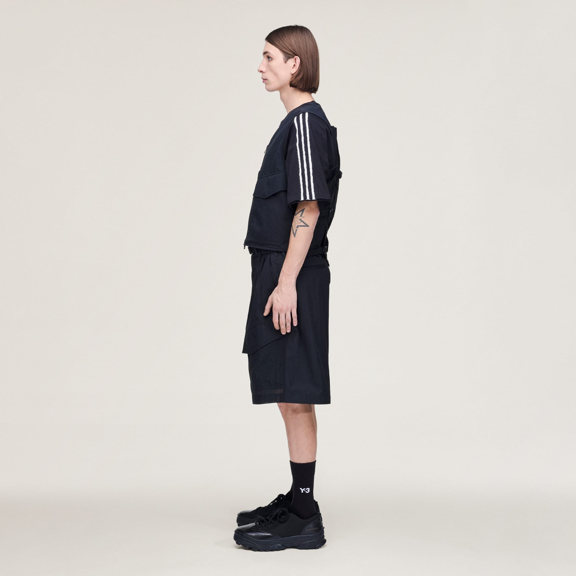 Apresentamos-te o colete Y-3 Tactical Utility que combina perfeitamente funcionalidade e moda. A metade superior do colete é feita de tecido de sarja, oferecendo durabilidade e uma textura refinada, enquanto a metade inferior é feita de material de malha leve, oferecendo respirabilidade e conforto. Concebido com um corte normal, podes utilizar os três ajustadores de fita e os mecanismos de fivela na parte de trás para personalizar o ajuste e a largura de acordo com a tua preferência. O colete apresenta um bloqueio de material à volta dos bolsos para maior robustez e interesse visual. O logótipo de transferência térmica em cetim tom sobre tom na parte superior central das costas acrescenta um toque subtil de marca. Quer estejas a navegar nas paisagens urbanas ou a explorar novos terrenos, este colete da adidas e Y-3 é a tua escolha para um estilo funcional.