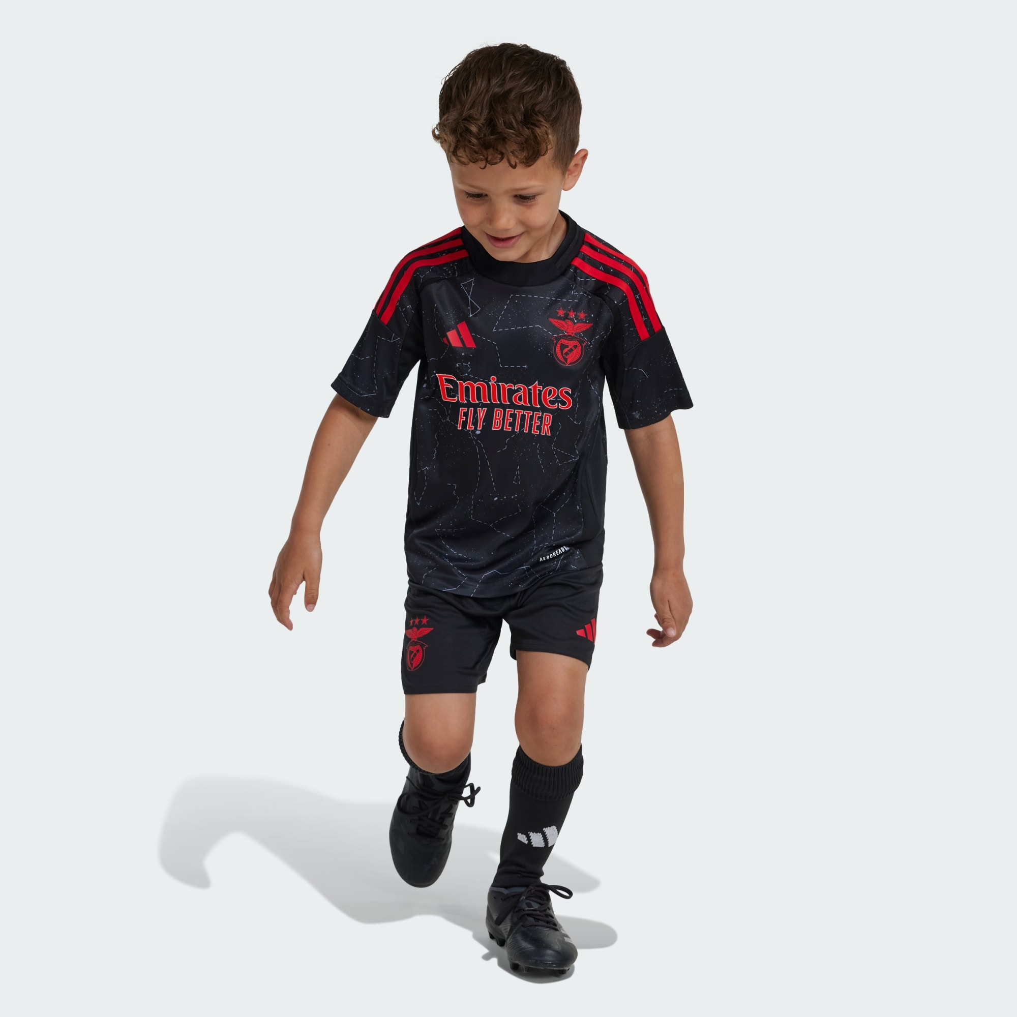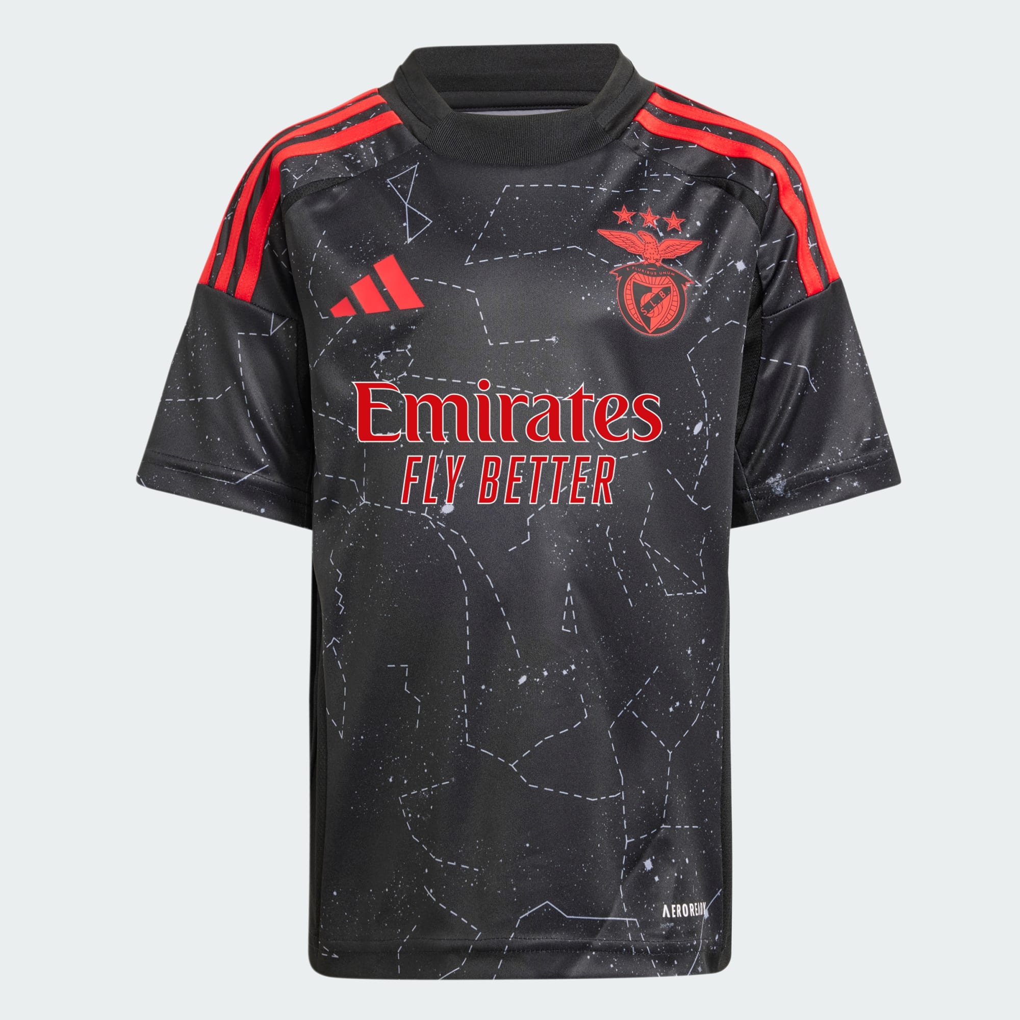 Escrito nas estrelas. Na temporada 24/25, o Benfica celebra o seu 120.° aniversário com um apropriadamente estelar equipamento alternativo da adidas. Criado para criança, este minikit partilha o seu design inspirado no céu noturno e o AEROREADY absorvente com o equipamento para o dia de jogo. Um par de emblemas termocolados anuncia um futuro entusiasmante para o teu jovem adepto.
