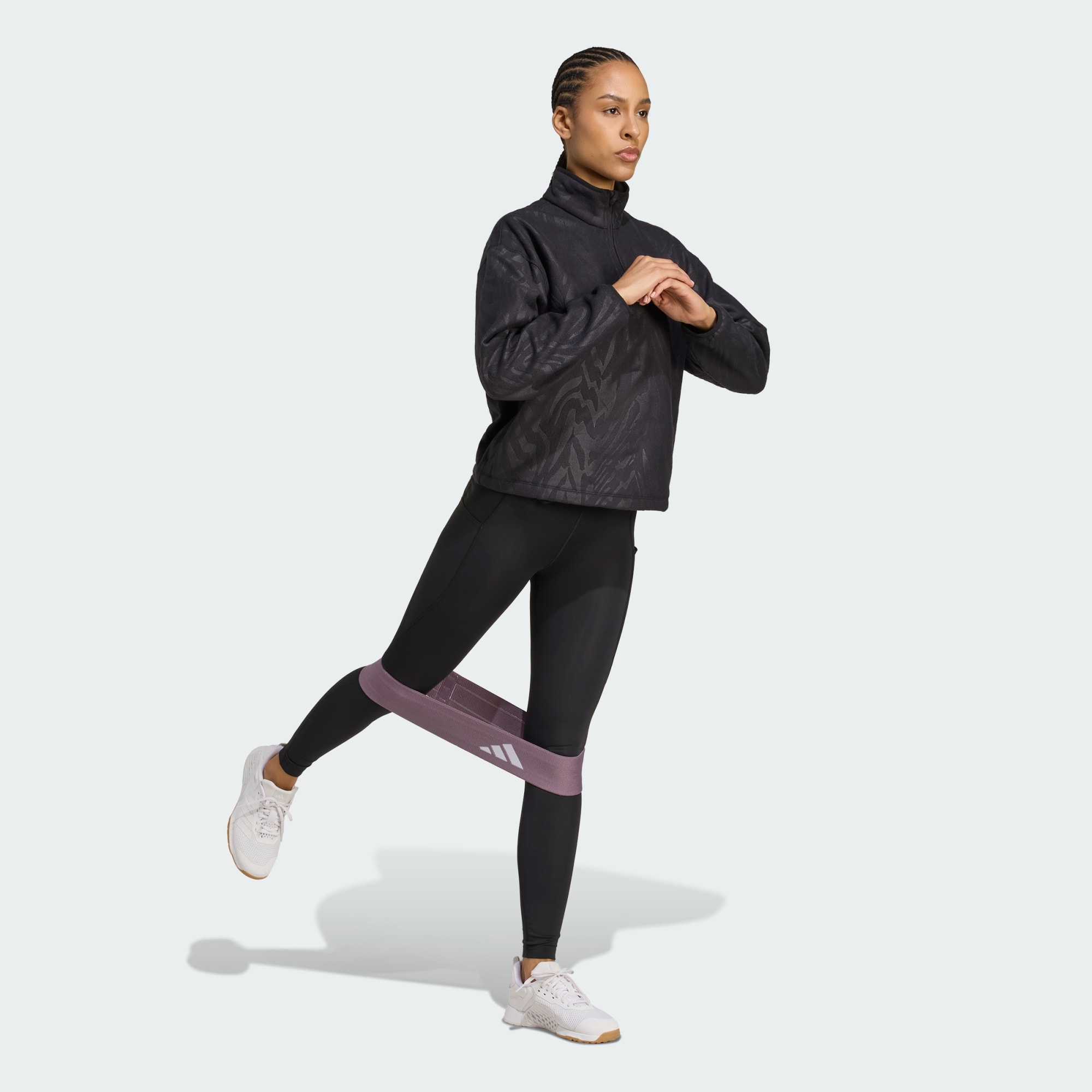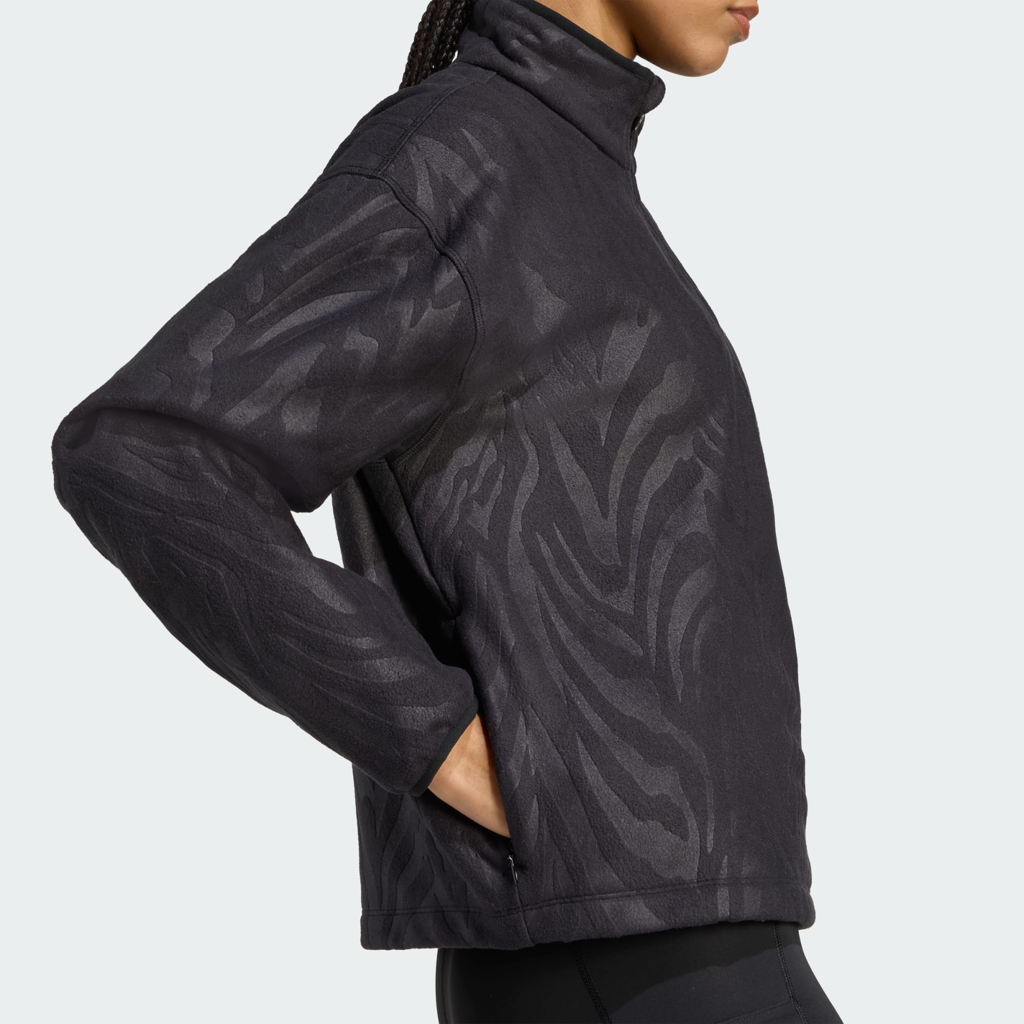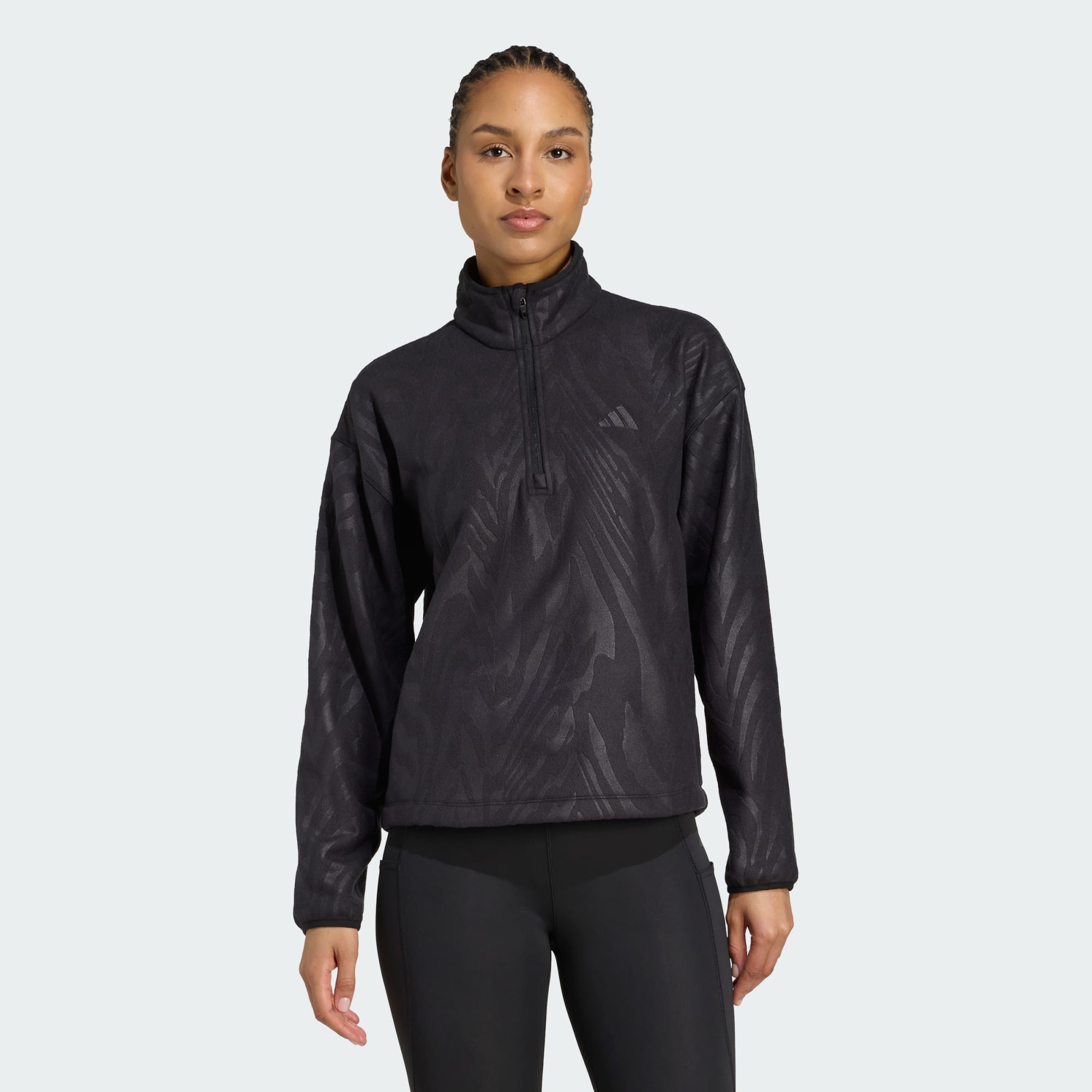 Usa este pulôver com fecho a 1/4 para exercícios ou encontros. Suave e aconchegante, é feito de fleece polar com um padrão tom sobre tom e um corte curto. O adidas AEROREADY absorve a humidade para te manter seco.