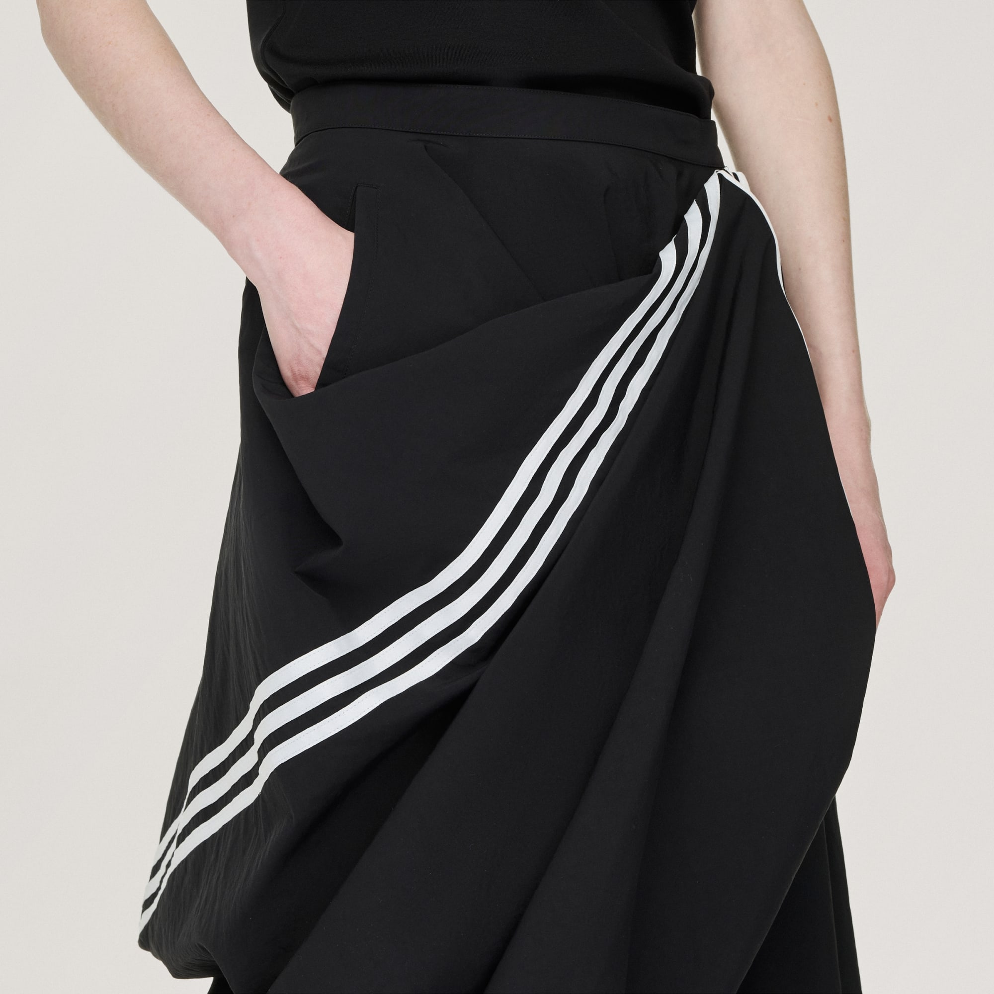 A saia de nylon Y-3 é uma silhueta elegante criada em nylon enrugado. Possui pormenores de arame que te convidam a explorar a sua versatilidade: podes dobrá-la, moldá-la e transformá-la de acordo com o teu estilo. Um bolso discreto dá o toque final.