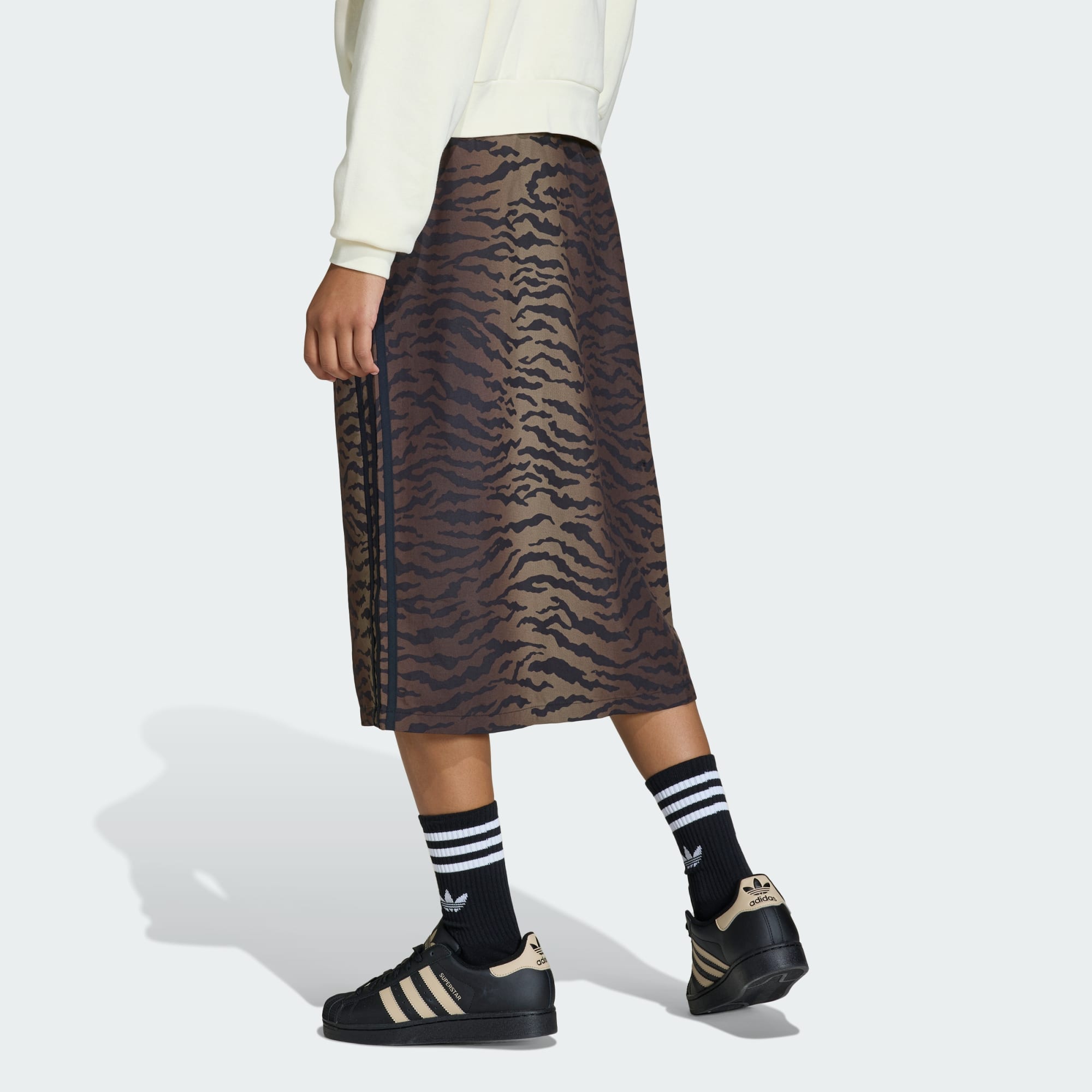 O estilo adidas Originals com uma ajuda do desporto-rei. Parte de uma coleção influenciada por estilos de futebol dentro e fora do campo, esta Saia de Sarja Slim AOP apresenta um padrão tigrado arrojado em toda a peça, que remete para o design de uma camisola de guarda-redes de arquivo. Com um corte justo, esta saia tem tudo a ver com linhas elegantes e estilo sem esforço. É fabricada em tecido de malha simples durável mas confortável e apresenta um fecho de cordão que te permite ajustá-la ao teu gosto. Parte do design atrativo, um trevo bordado e 3 riscas coloridas acrescentam um toque de legado clássico da adidas que te ajudará a manter o estilo enquanto mostras o teu espírito Originals.