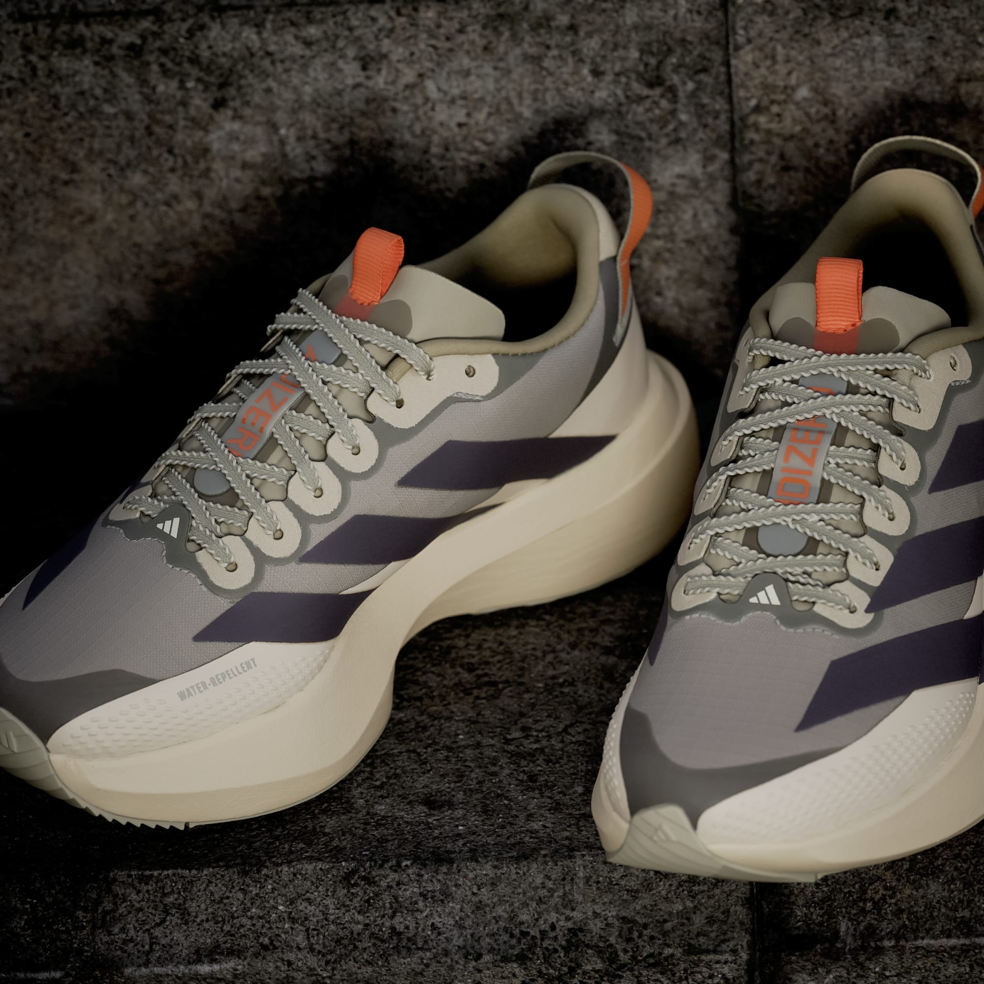 Estas sapatilhas de ajuste normal apresentam um tecido em malha ripstop e uma proteção contra lama que proporcionam repelência à água e proteção contra os elementos, enquanto o ADIZERO sling launch característico oferece um bloqueio adicional no calcanhar.
