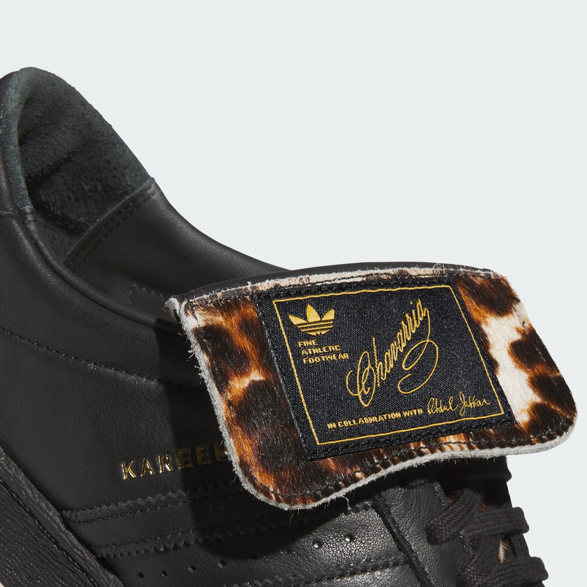 - "KAREEM" em baixo relevo na sapatilha direita e "WILLY" na sapatilha esquerda, em folha dourada