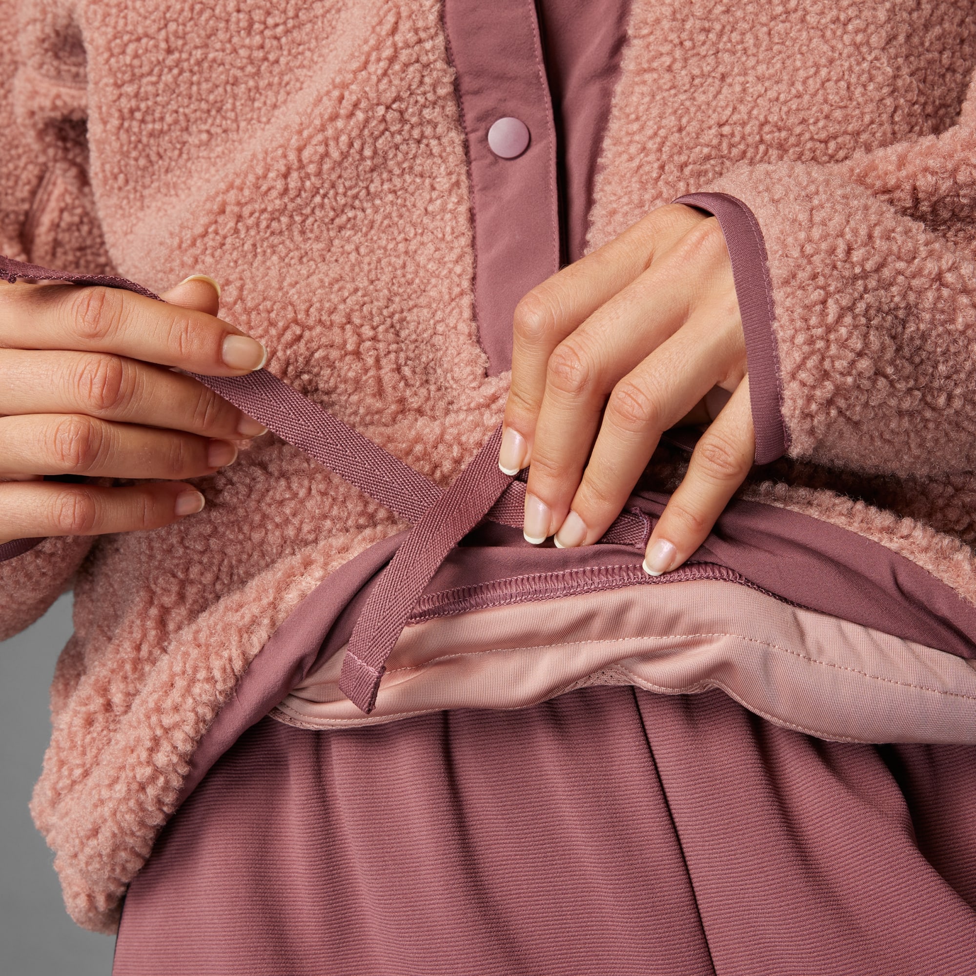 Uma camisola de caminhada em fleece felpudo, feita com materiais reciclados.